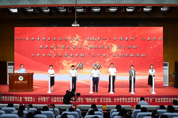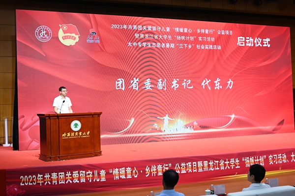 黑龍江經濟網訊(王丹陽 記者祝東)7月5日,2023年共青團關愛留守兒童“情暖童心·鄉(xiāng)伴童行”公益項目暨黑龍江省大學生“揚帆計劃”實習活動、大中專學生志愿者暑期“三下鄉(xiāng)”社會實踐活動啟動儀式在哈爾濱商業(yè)大學隆重舉行。共青團黑龍江省委副書記代東力、陳海平,哈爾濱商業(yè)大學副校長姜國峰,省直機關團工委書記趙明瑞,黑龍江省人力資源和社會保障廳、省知識產權局、省人民檢察院、省青少年發(fā)展基金會、哈爾濱市南崗區(qū)民政局、哈爾濱海關、哈爾濱海事局相關領導,以及哈爾濱商業(yè)大學的志愿者和哈爾濱市樂業(yè)小學師生代表參加本次活動。