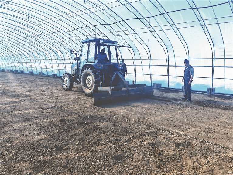 在第二管理區(qū)大棚基地內(nèi),種植戶冷德錄正和幾名種植戶通過戶間合作的方式進(jìn)行平床作業(yè)?!霸瓉砦覀兪侨斯て酱?,3個(gè)人用4個(gè)小時(shí)才能平完一棟大棚,費(fèi)時(shí)費(fèi)力?,F(xiàn)在用平床機(jī),1個(gè)小時(shí)就能平完,效率高了,作業(yè)標(biāo)準(zhǔn)也高了?!崩涞落浾f。