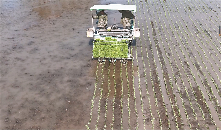 在樺南縣域內(nèi)的曙光農(nóng)場(chǎng)有限公司第三管理區(qū)水稻基地,種植戶們正忙著搬運(yùn)秧苗。伴隨著轟鳴的機(jī)器聲,農(nóng)機(jī)手駕駛著裝配有北斗導(dǎo)航系統(tǒng)的高速插秧機(jī)開展作業(yè)。插秧機(jī)駛過之處,一株株秧苗從苗盤上依次滑落,均勻有序地插播在水田里。插秧機(jī)上,工人不時(shí)為插秧機(jī)補(bǔ)充秧苗,不一會(huì)兒,整片水田披上了綠裝,一行行整齊有序、間隔適中的秧苗在陽(yáng)光下煥發(fā)著勃勃生機(jī)。