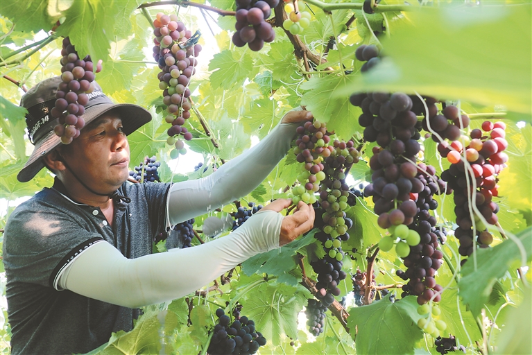 “春棚栽培的葡萄在8月中旬成熟,而在暖棚里,由于溫度、濕度得到科學(xué)精準(zhǔn)控制,葡萄成熟得更早,產(chǎn)量更高。7月10日左右即可上市,搶占市場(chǎng)空缺?!笔卟斯矩?fù)責(zé)人王軍強(qiáng)邊說一邊拿起手機(jī)拍攝,為一周后葡萄上市進(jìn)行宣傳。