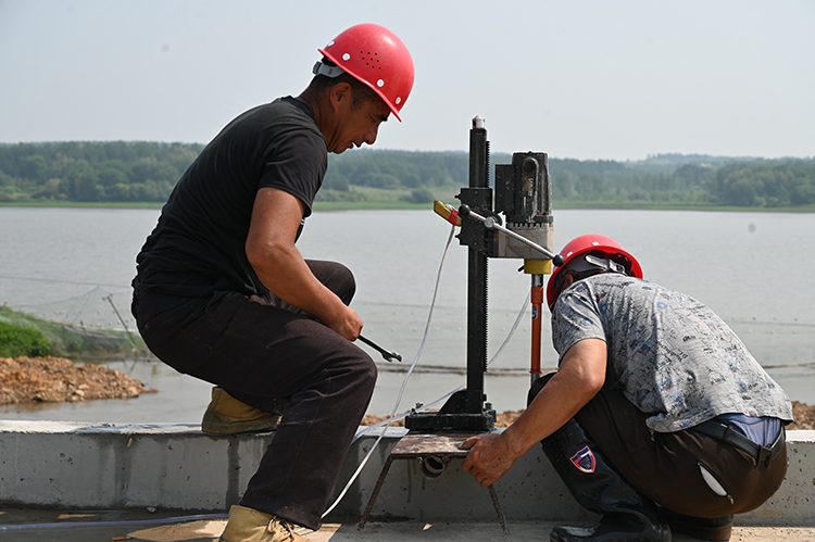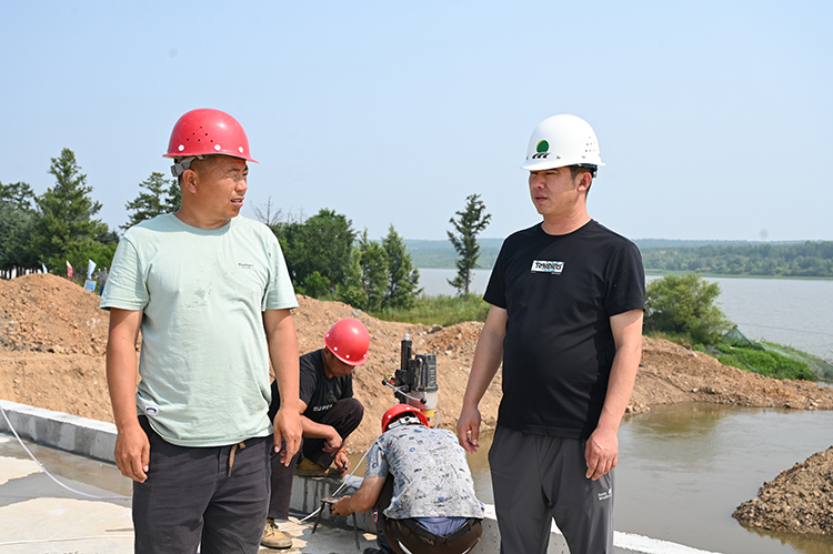 在引龍河農(nóng)場有限公司青年水庫除險(xiǎn)加固工程施工現(xiàn)場,機(jī)器轟鳴,施工現(xiàn)場對大壩固腳及安全圍欄施工作業(yè),增強(qiáng)壩基防滲能力,消除大壩防洪隱患。同時(shí)與施工、設(shè)計(jì)部門一同研究,采用增設(shè)防滲膜圍堰措施,加快施工進(jìn)度,制定了趕工計(jì)劃,倒排工期,確保汛限水位以下部分在主汛期來臨前全部完成。此外,現(xiàn)場還有督導(dǎo)組對水庫除險(xiǎn)加固工程進(jìn)行檢查。