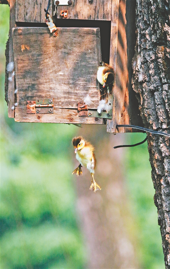日前,哈爾濱市兆麟公園鴛鴦湖畔,14只破殼不久的小鴛鴦在媽媽的帶領(lǐng)下,從人工巢中“撲騰撲通”跳到池塘中,開(kāi)啟它們的新生活。