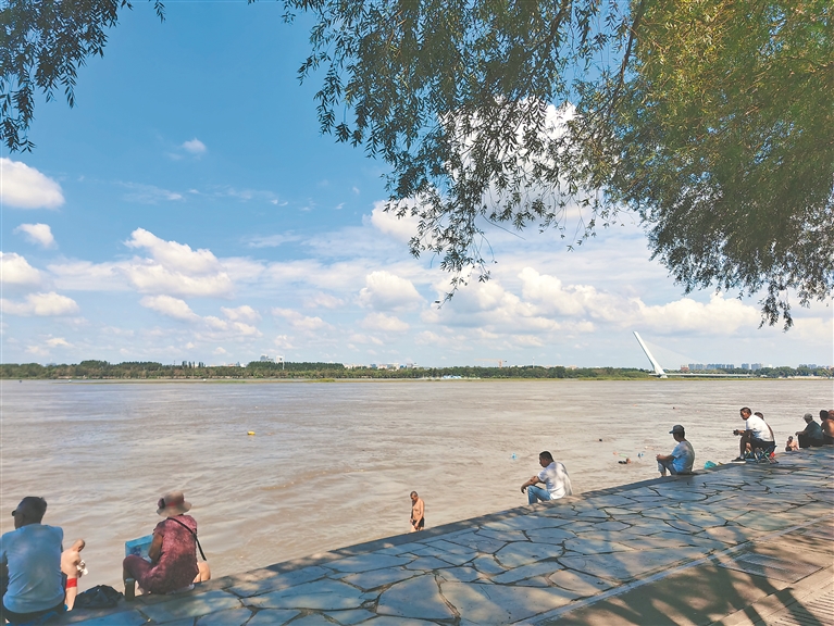 13日,記者看到松花江水流平緩。松花江干流哈爾濱水文站監(jiān)測的水位為117.68米,低于警戒水位0.62米,流速6910立方米/秒。