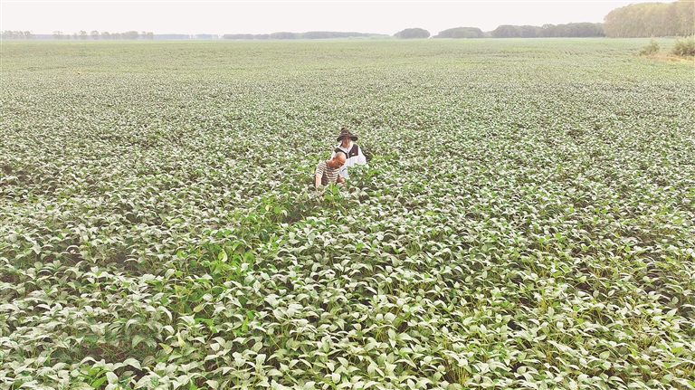 26日,在北大荒農(nóng)業(yè)股份二九〇分公司一片大豆田中,種植戶戎立國(guó)正在查看作物長(zhǎng)勢(shì)。表面望去,這片田地與普通大豆無(wú)異,這里實(shí)際種植的,是特色黑豆品種。