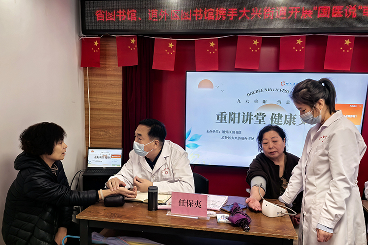 重陽講堂 健康義診。大興街道辦事處攜手黑龍江省圖書館、道外區(qū)圖書館開展“‘國醫(yī)說’重陽講堂健康義診”活動。黑龍江省中醫(yī)藥科學(xué)院的專家教授為大家詳細地講解了預(yù)防三高的注意事項、三高人群的飲食禁忌等知識,提高了大家對高血壓病的認識。并為老年人把脈針灸、測量血壓,解答老年病防治等問題,讓轄區(qū)老人足不出戶享受優(yōu)質(zhì)的醫(yī)療服務(wù),幫助他們提升健康素養(yǎng),營造中醫(yī)藥傳承的文化氛圍。