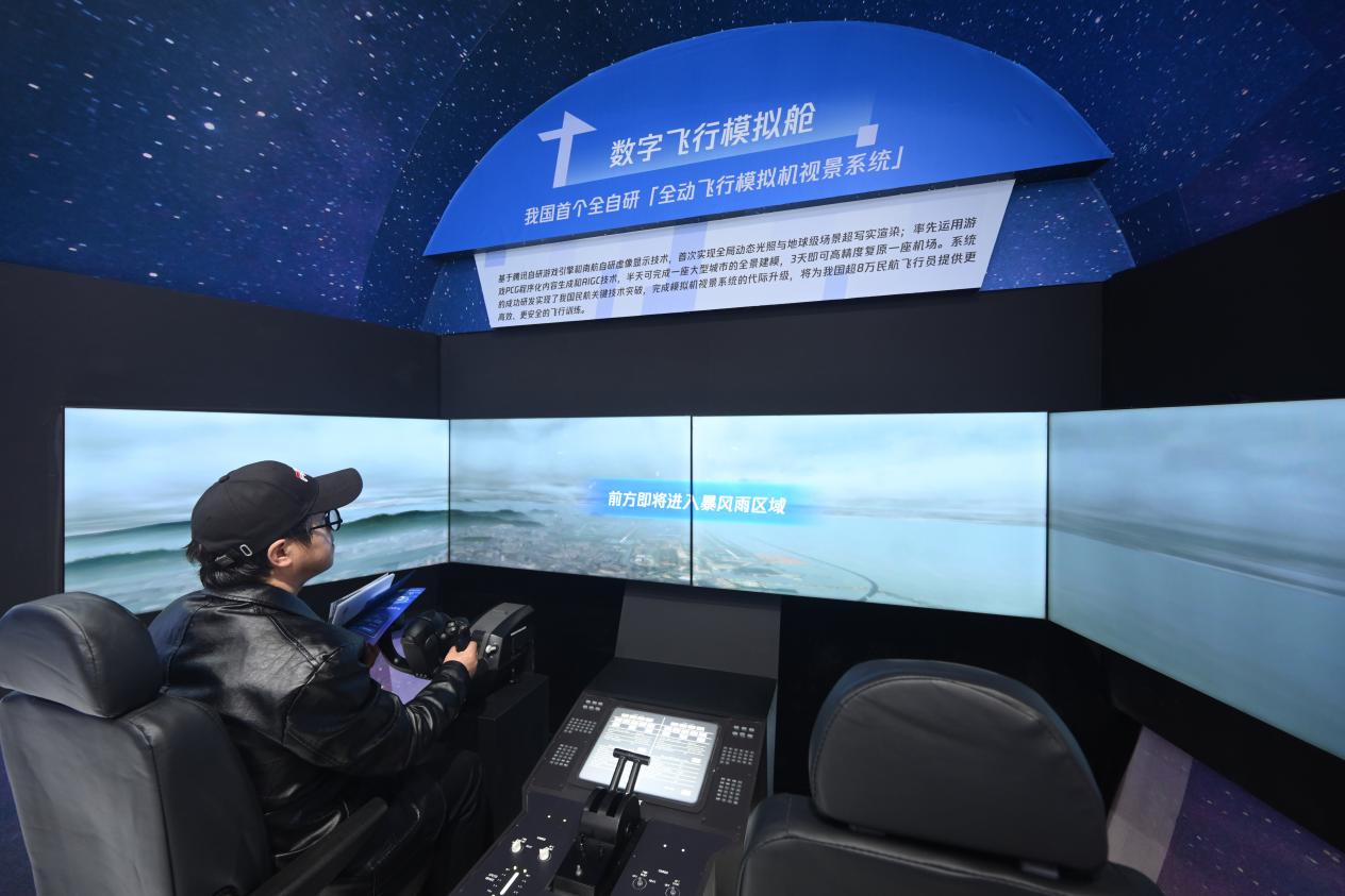 “只需要推動操縱桿,就能操作系統(tǒng),體驗民航飛行員第一視角下、擬真的訓(xùn)練場景……”在展區(qū)前方,由南航自研虛像顯示技術(shù)和騰訊自研游戲引擎技術(shù)共同打造的全動飛行模擬機視景系統(tǒng),吸引眾多參觀者體驗?;隍v訊自研游戲引擎,系統(tǒng)首次實現(xiàn)全局動態(tài)光照與地球級場景超寫實渲染,多邊形生成面數(shù)較之前提升380倍、貼圖精細(xì)度提升100倍,助力實現(xiàn)我國民航關(guān)鍵技術(shù)突破。