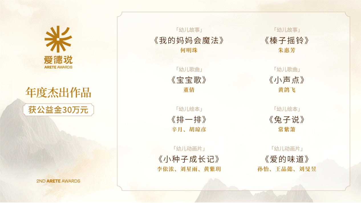 揭曉盛典上,幼兒故事《我的媽媽會(huì)魔法》《榛子搖鈴》,幼兒歌曲《寶寶歌》《小聲點(diǎn)》,幼兒繪本《排一排》《兔子說(shuō)》及幼兒動(dòng)畫(huà)片《小種子成長(zhǎng)記》《愛(ài)的味道》8部作品獲評(píng)第二屆“愛(ài)德說(shuō)”幼兒德育作品征集活動(dòng)“年度杰出作品”,每部作品獲得主辦方提供的公益金人民幣30萬(wàn)元。
