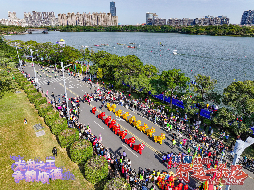 桂畔湖上觀競(jìng)渡,順?lè)迳较陆育埜!?2月8日,陽(yáng)光明媚,天朗氣清,水上,來(lái)自全國(guó)各地的龍舟勁旅齊聚順德,展開水上競(jìng)逐;岸邊,薈萃順德十鎮(zhèn)街龍文化元素的“文化巨龍”,開啟4.5公里的精彩巡游。