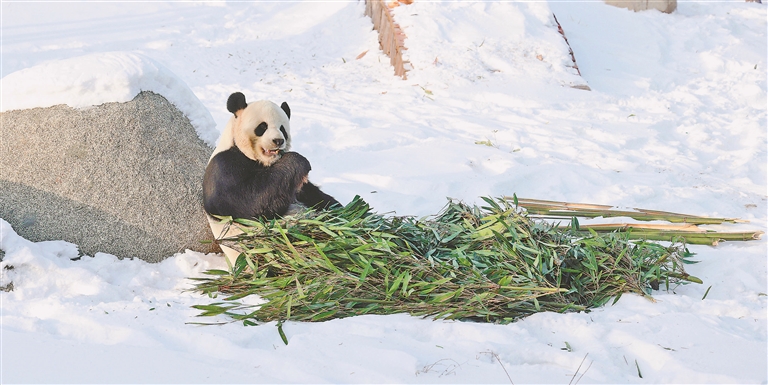 尤其是“佑佑”,曬著午后暖陽(yáng),坐在室外的雪地里,大口“狂炫”竹葉,這一口吃夠了,就尋覓著從雪里刨出來(lái)一根竹筍,秒變“剝筍小哥”?!坝佑印边€時(shí)不時(shí)停下來(lái),盯著人群定格幾秒,仿佛是專門為游客拍照擺好姿勢(shì),令不少南方小伙伴感嘆“開了眼界”。