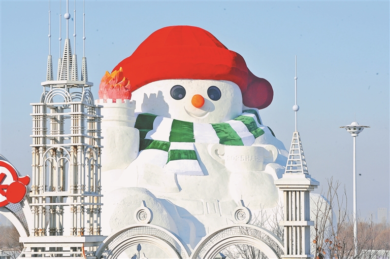 近日,哈爾濱市道里區(qū)群力江畔雪人碼頭,23米高的大雪人主體已經(jīng)完成,工人正在進(jìn)行收尾工作。這座大雪人頭戴紅帽子,圍著白綠相間的圍脖,手里舉著火炬,十分可愛,吸引了許多游客和市民前來(lái)觀看。