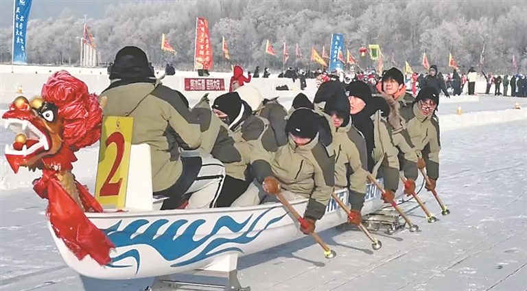 伴隨著動感的音樂聲和歡呼聲,冰面之上百釬齊發(fā),龍舟疾馳。隊(duì)員們劃槳?jiǎng)幼髡R劃一,鑼鼓聲、吶喊聲形成了一曲激昂的冬日交響樂。當(dāng)冠軍隊(duì)伍沖線的一刻,現(xiàn)場爆發(fā)出更熱烈的歡呼聲,豪邁的氣勢與聲浪響徹萬寶湖上空。