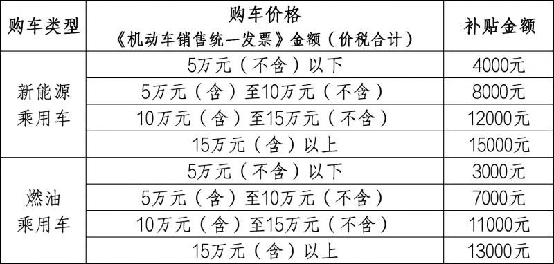 細則規(guī)定,消費者轉讓的舊車應于2025年1月8日前登記在申請人名下。在購買新車時,按照《機動車銷售統(tǒng)一發(fā)票》金額(價稅合計),置換車輛為新能源乘用車新車的:5萬元(不含)以下每輛補貼4000元;5(含)-10萬元(不含)補貼8000元;10(含)-15萬元(不含)補貼12000元;15萬元(含)以上補貼15000元。如置換燃油乘用車:5萬元(不含)以下補貼3000元;5(含)-10萬元(不含)補貼7000元;10(含)-15萬元(不含)補貼 11000元;15萬元(含)以上補貼13000元。補貼資金用完活動即止。