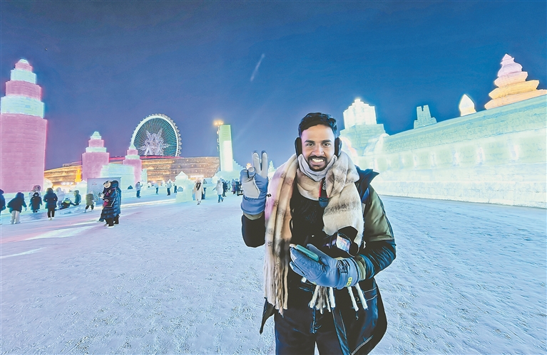 夜幕降臨,園區(qū)里五彩斑斕。徜徉其中,記者不時與遠(yuǎn)道而來的國際友人擦肩而過。印度游客庫洲倫一路走走停停,仿佛一位尋寶者,在冰雪編織的夢幻王國中盡情探索。他胸前挎著一臺單反相機,手中握著手機,眼中閃爍著滿滿的驚奇。每一次駐足,每一次與冰雕雪塑的凝視,都伴隨著按下相機快門的聲響。