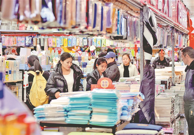 19日,哈爾濱市道里區(qū)一處大型批發(fā)市場(chǎng),許多家長(zhǎng)帶著孩子前來(lái)選購(gòu)文具。
