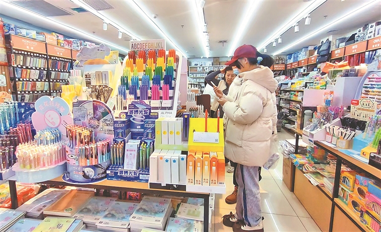 在文教用品專(zhuān)柜里,各種筆記本、款式新穎的筆、不同顏色的文具盒、書(shū)包等琳瑯滿(mǎn)目,應(yīng)有盡有。銷(xiāo)售人員介紹,新學(xué)期即將開(kāi)始,文具的銷(xiāo)售量持續(xù)增多。家長(zhǎng)為孩子挑選文具時(shí),更傾向于選擇環(huán)保的產(chǎn)品。