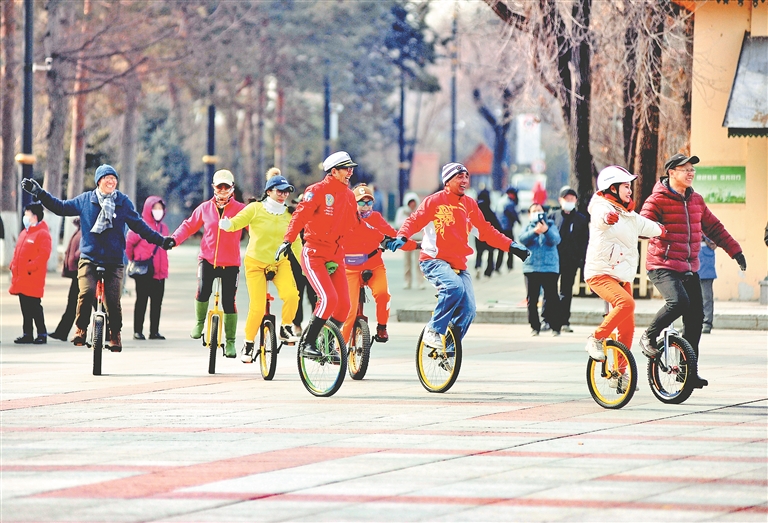 在哈爾濱市江畔斯大林公園內(nèi)的小廣場(chǎng)上,許多人在練習(xí)騎獨(dú)輪車。在樹林旁,數(shù)十位老年人在跳民族舞。公園的人行道上,不時(shí)有成群的徒步者走過。
