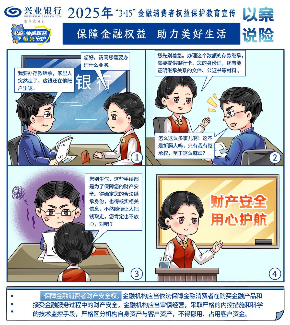 “保障金融權(quán)益 助力美好生活”,興業(yè)銀行哈爾濱分行2025年“3·15”金融消費(fèi)者權(quán)益保護(hù)宣傳活動(dòng)進(jìn)行中,本期向您介紹金融消費(fèi)者八項(xiàng)權(quán)益中的財(cái)產(chǎn)安全權(quán)。