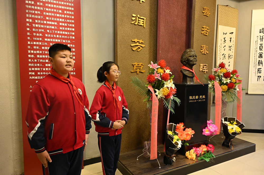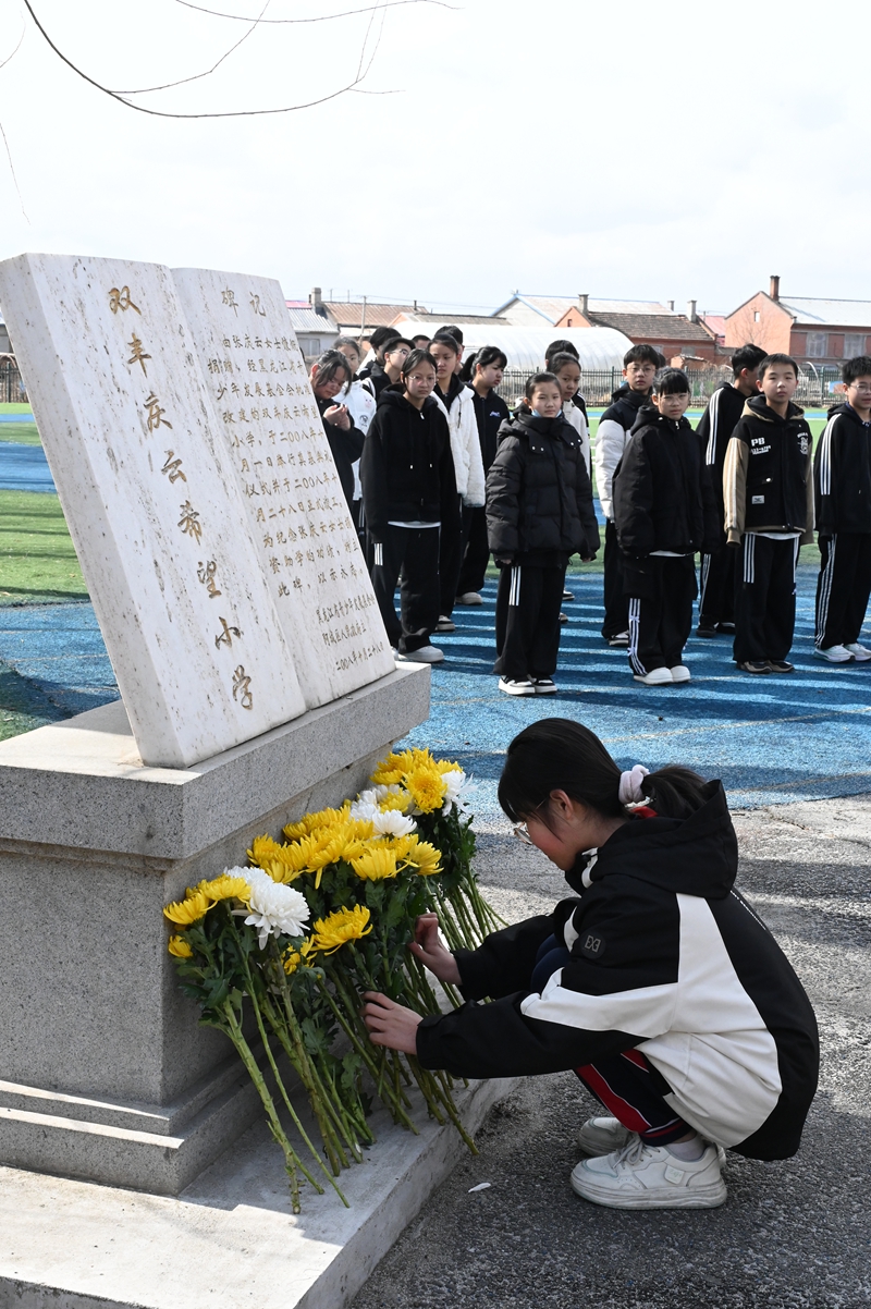 活動中,黨員和少先隊員代表向老黨員張慶云同志紀念碑敬獻鮮花,并全體緬懷。團省委、省捐助中心、哈爾濱市注冊會計師行業(yè)黨員代表為學生們送去了圖書和學習用品。