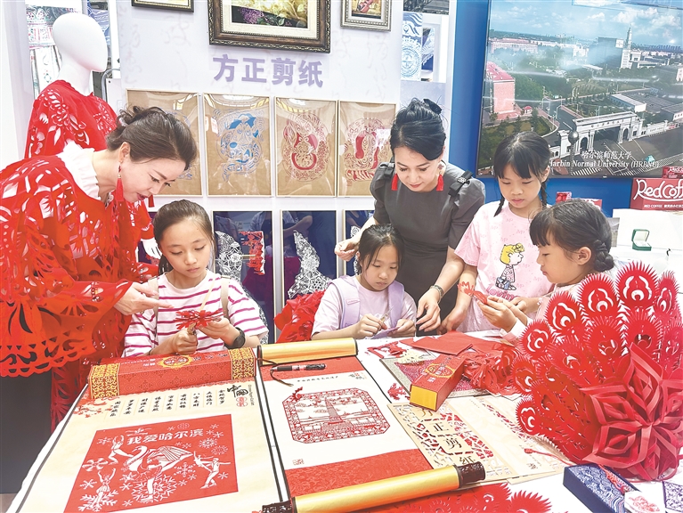 方正剪紙展區(qū)工作人員把剪紙穿在身上,手把手輔導(dǎo)小觀眾體驗(yàn)剪紙技藝。本報記者 韓東賢攝