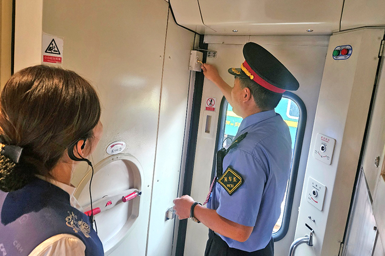 列車(chē)長(zhǎng)在對(duì)車(chē)門(mén)加鎖情況進(jìn)行檢查。(韓峰 攝)