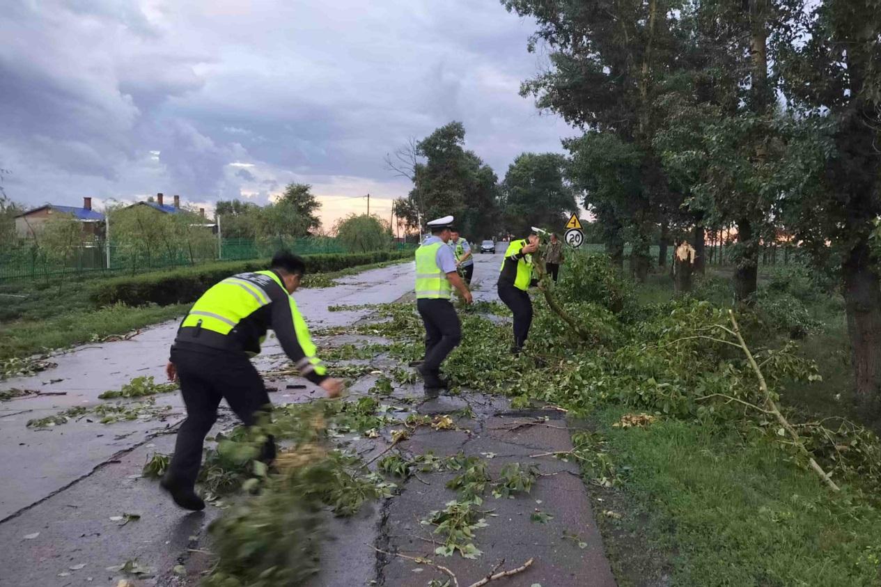 風(fēng)雨中,執(zhí)勤交警徒手清理散落在道路上的樹枝、落葉等雜物,對倒伏樹木、斷裂樹枝進(jìn)行臨時處置,將其移至路邊不妨礙交通的位置,爭分奪秒恢復(fù)道路通行。同時通過警車喊話、帶路等方式,引導(dǎo)過往車輛減速慢行,全力保障道路交通安全、暢通、有序。