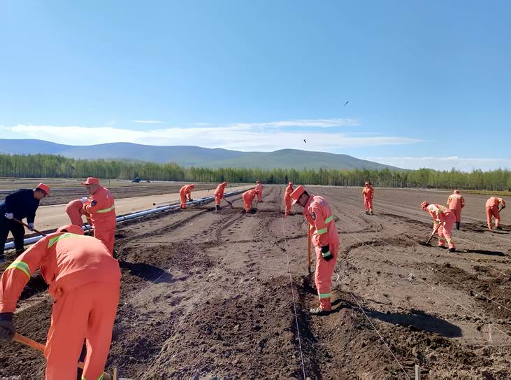 新林林業(yè)局苗圃職工正在拉線培土做苗床(劉磊攝)