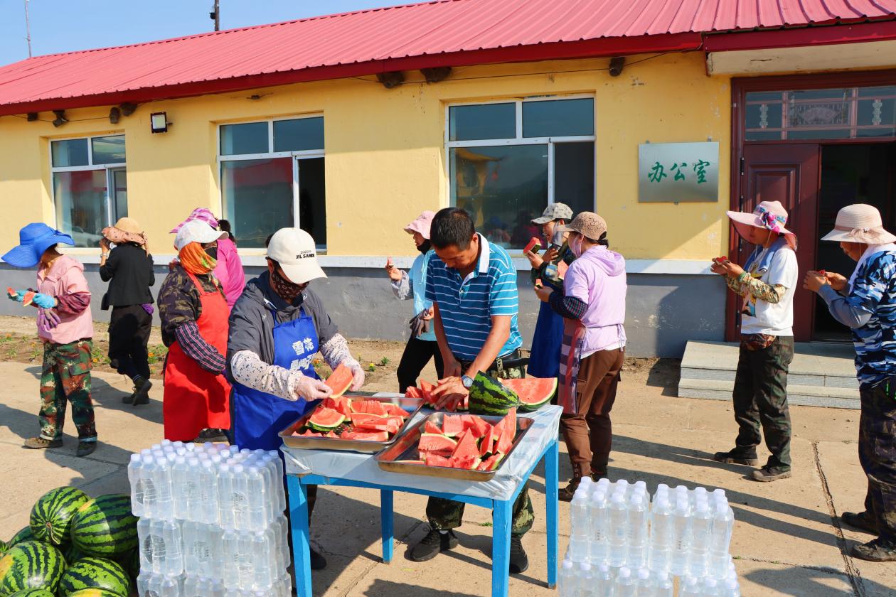 慰問組工作人員正在為苗圃職工切西瓜(冀威威 攝)