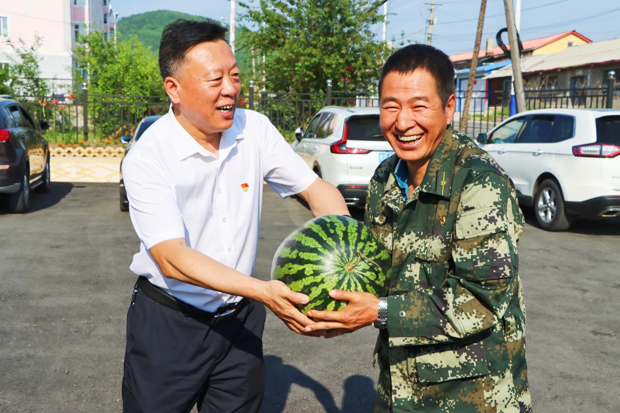 新林林業(yè)局黨委委員、工會主席周成仁為職工送上西瓜(冀威威 攝)