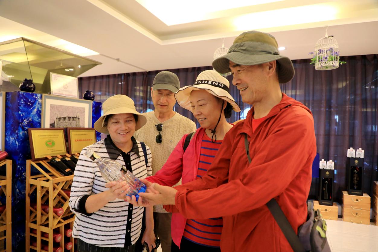 《情系阿木爾》作者錢國良(右一)和老知青妻子劉洪建(右二),實地參觀北極冰藍莓酒莊,并對產(chǎn)品產(chǎn)生了濃厚興趣(王力 攝)