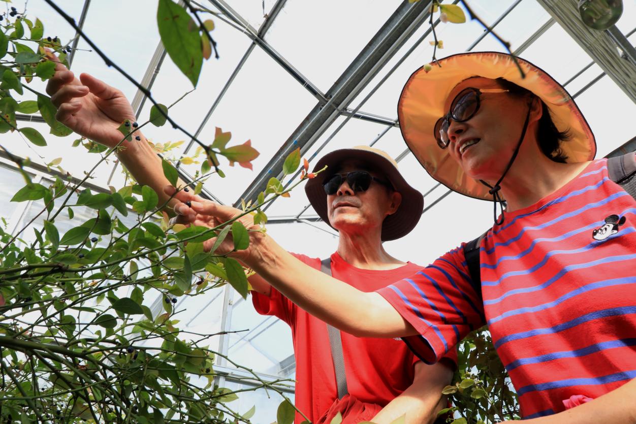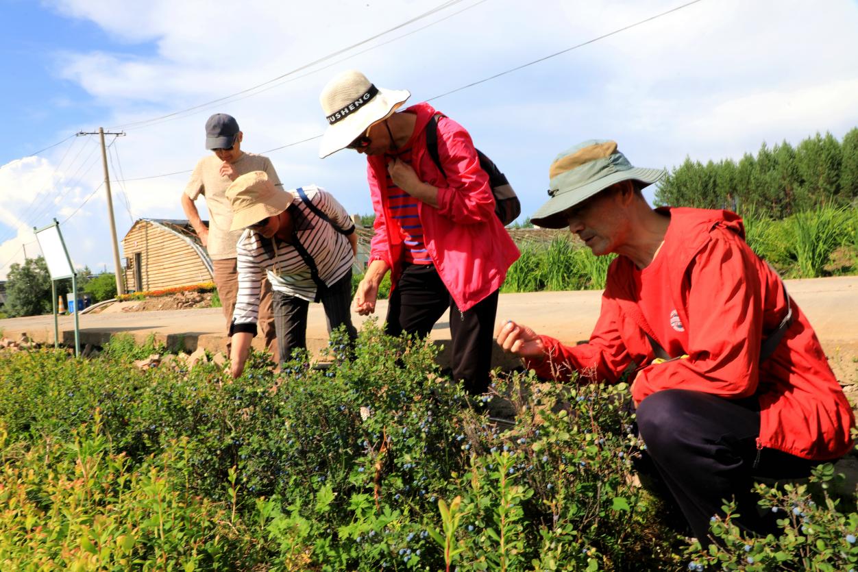 《情系阿木爾》作者錢國良夫婦和一路同行的杭州游客孫華憲夫婦,被藍莓園培育的美登藍莓吸引了眼球(王力 攝)