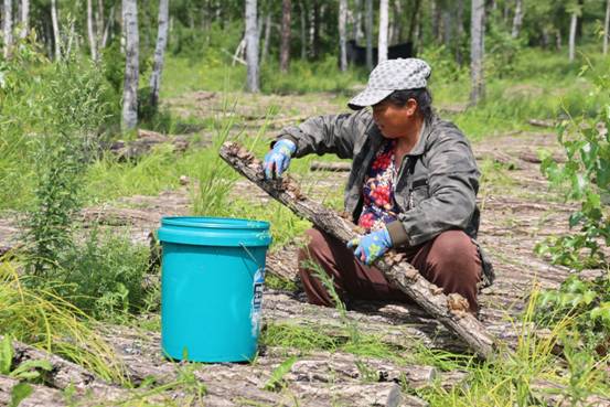 河口林場(chǎng)職工正在采摘椴木木耳(李涵鈺 攝)