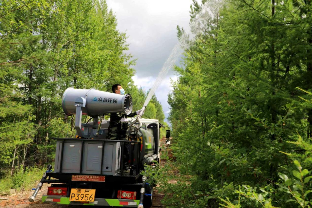 阿木爾林業(yè)局防治站工作人員利用高效噴霧車(chē),模擬防治松樹(shù)鉆蛀類(lèi)害蟲(chóng)災(zāi)害(王力 攝)