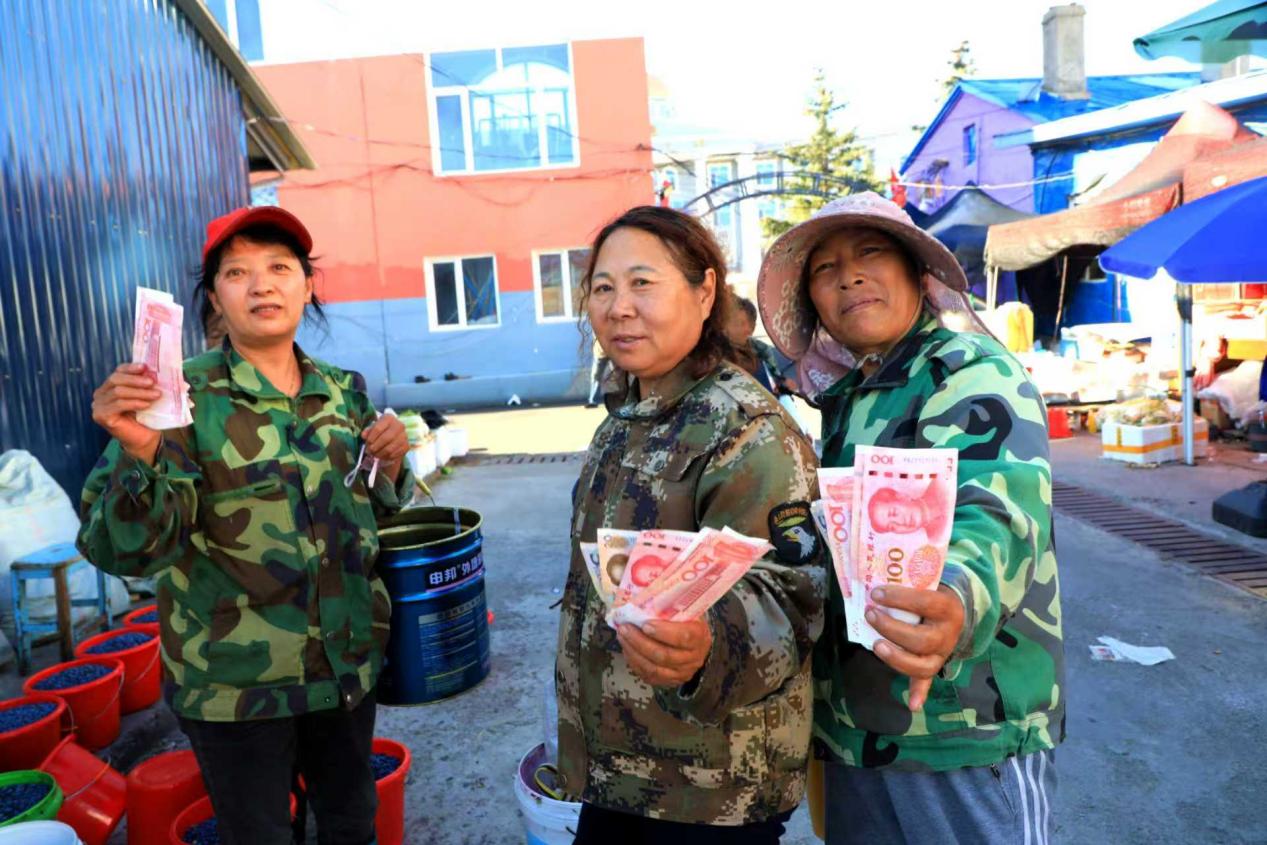 阿木爾林業(yè)局退休職工霍淑蘭(中)三姐妹將手采的野生藍(lán)莓果銷售后臉上洋溢著收獲的喜悅(王力 攝)