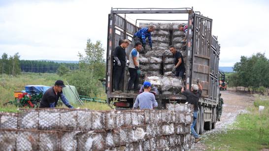 加格達奇林業(yè)局林場職工將大鵝運輸籠裝車(林佳晨 攝)