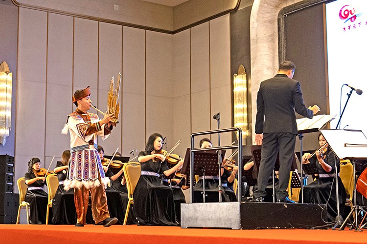 推介會在交響幻想曲《歌仙·劉三姐》中拉開帷幕,用美妙的音樂將現(xiàn)場觀眾帶到了壯鄉(xiāng)山水間。蘆笙與樂隊《節(jié)日的邊寨》、歌曲《廣西尼的呀》《連心歌》等極具廣西民族風情的旋律,將廣西各族兒女團結奮進的精神風貌娓娓道來。