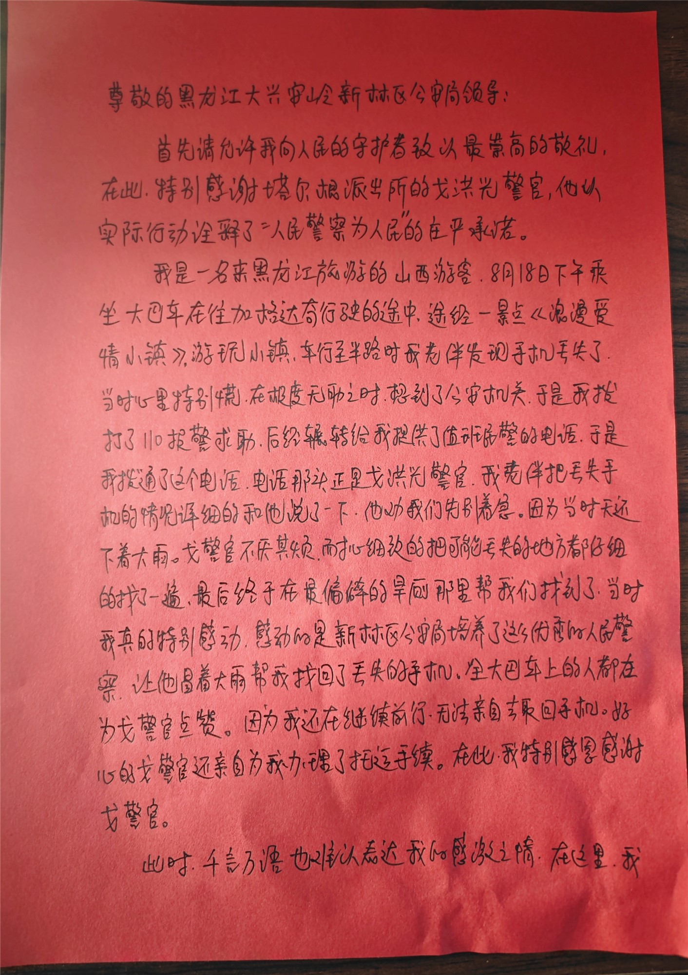 “當時天氣下著大雨,本來我已經(jīng)不抱希望了,沒想到警察這么負責任地幫我找,千言萬語也難以表達我的感激之情,我和老伴及家人再一次向大興安嶺新林區(qū)公安局表示感謝?!庇慰蜌w家后,始終惦記著這份高效與細致,親手寫一封感謝信寄到新林區(qū)公安局塔爾根警務室,對民警迅速為其找回手機表示感謝。