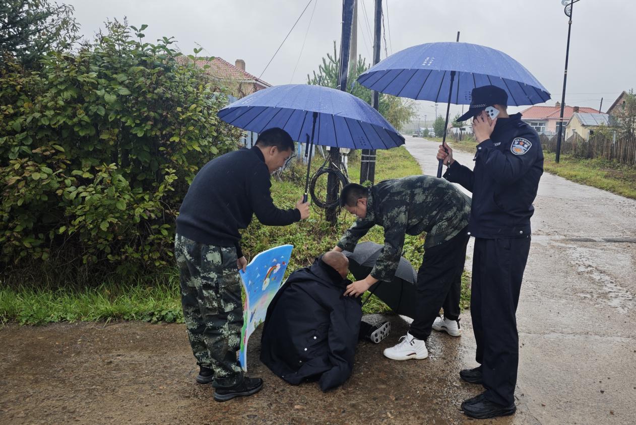 到達(dá)現(xiàn)場后,民警發(fā)現(xiàn)老人面部有明顯擦傷,腿部無法活動。為避免隨意移動造成二次傷害,民警第一時間找來雨傘和棉襖,一邊撐傘為老人遮擋風(fēng)雨,一邊用棉襖裹住老人身體保暖。同時,民警迅速聯(lián)系老人家屬,并撥打120急救電話,家屬表示希望將老人送往縣里醫(yī)院治療。民警又緊急協(xié)調(diào)縣里的救護(hù)車,在等待期間,民警一直撐著傘守護(hù)老人,并與老人輕聲交談,耐心安撫老人情緒,緩解其緊張與疼痛。
