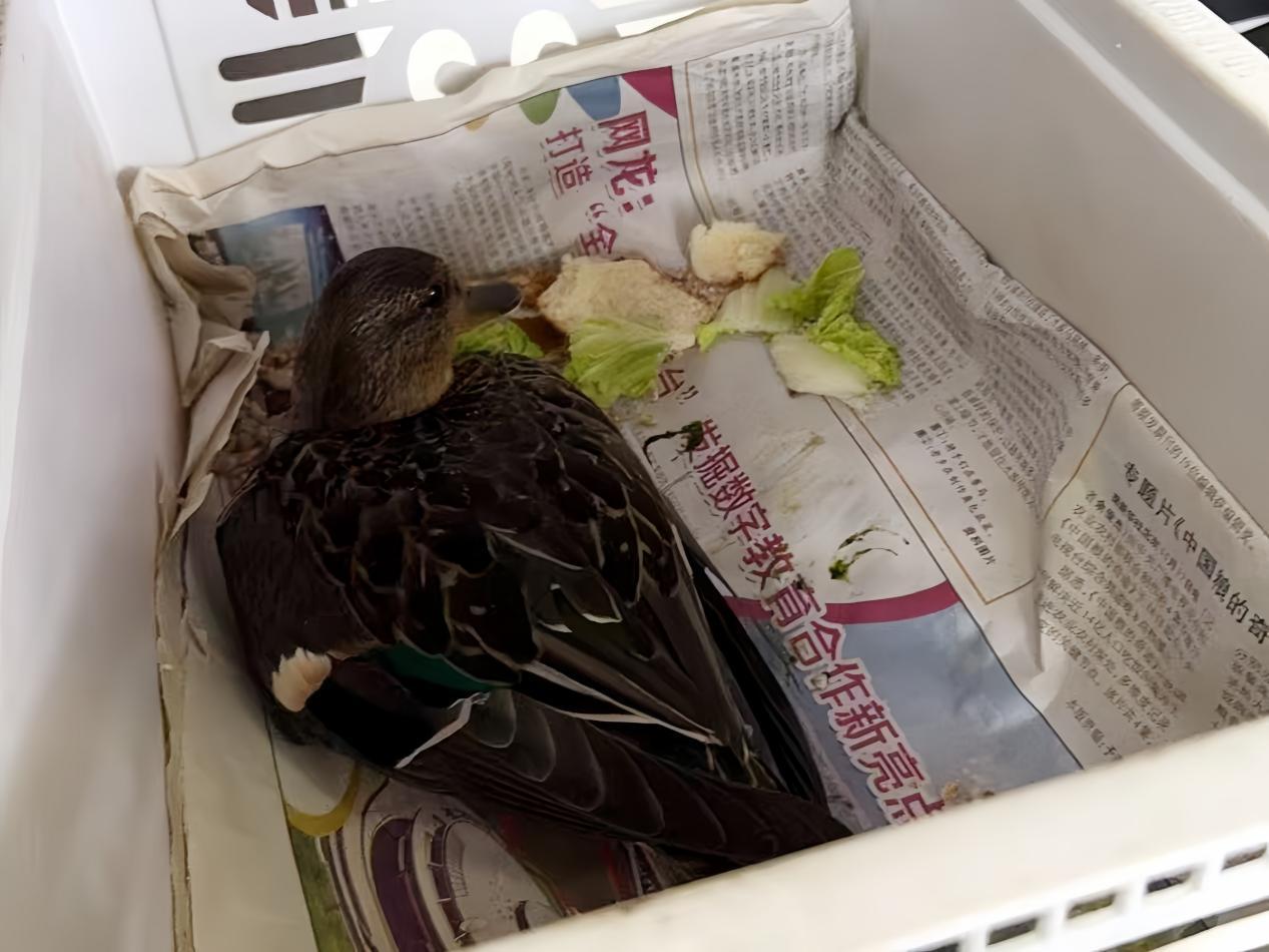 大烏蘇林場防火宣傳車在鹿苑山莊周邊巡護時,工作人員發(fā)現(xiàn)路邊草叢中有疑似受傷動物。下車查看后,確認是一只行動遲緩、無法正常飛行的幼鳥。為防止其二次受傷,工作人員當即在現(xiàn)場設置簡易防護措施,將其帶回林場辦公室。并第一時間聯(lián)系新林區(qū)林業(yè)和草原局技術(shù)人員,經(jīng)過鑒定后,該幼鳥為國家二級保護動物綠頭鴨,經(jīng)檢查,其翅膀受傷骨折,已喪失正常飛行能力。目前,這只被救助的綠頭鴨已移交至新林區(qū)林業(yè)和草原局接受進一步治療,待康復后將放歸大自然。