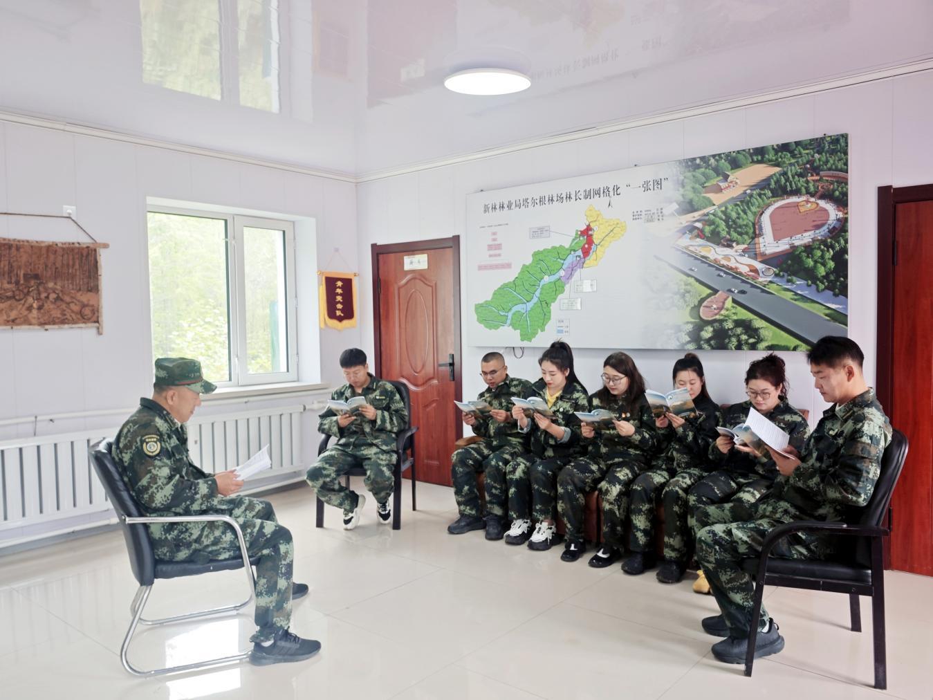 塔爾根林場(chǎng)機(jī)關(guān)工作人員在管護(hù)站“學(xué)習(xí)角”進(jìn)行理論學(xué)習(xí)(李輝 攝)