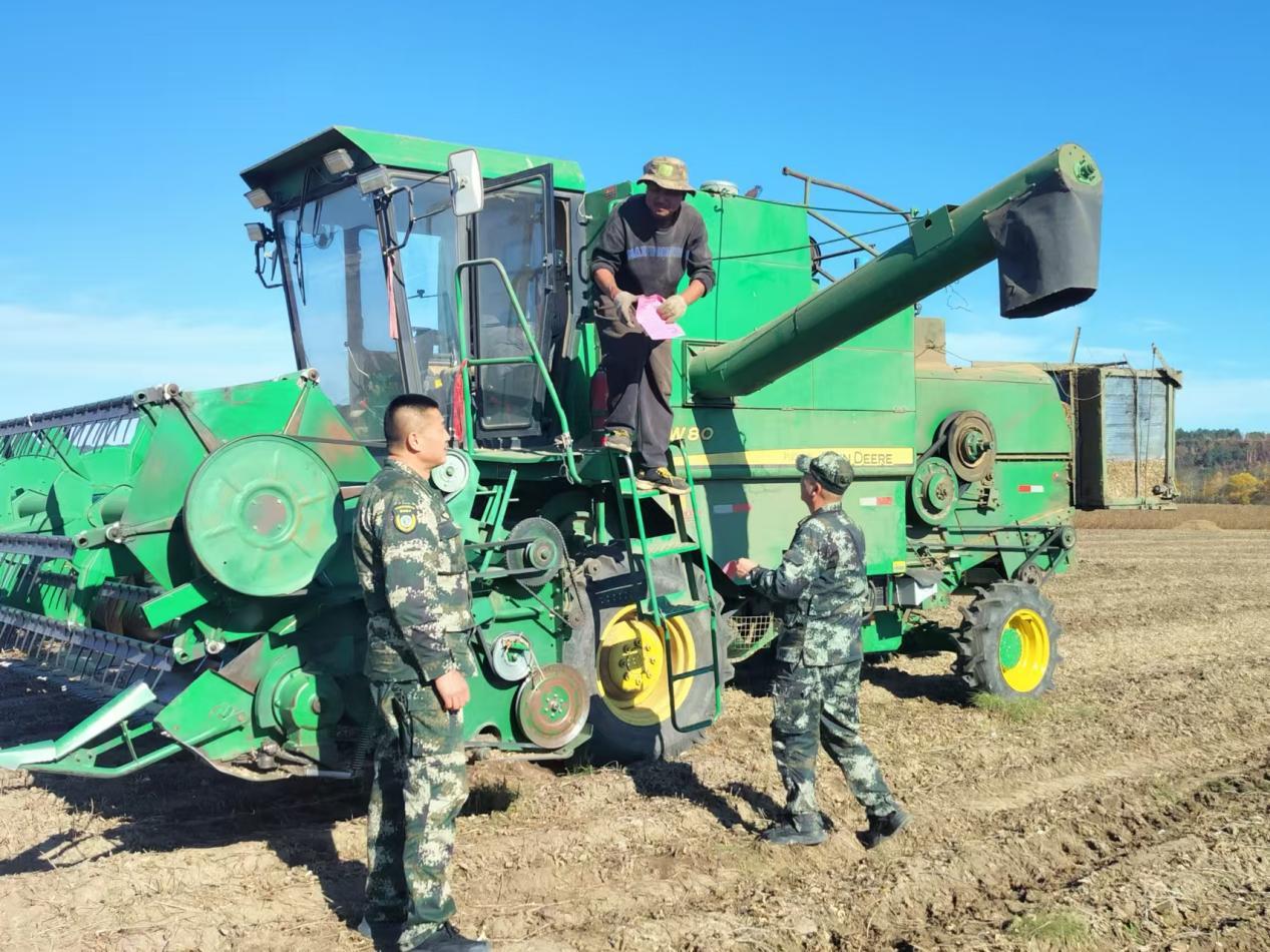 督導組在為秋收農(nóng)機操作員講解防火法規(guī)(孟鵬翔 攝)