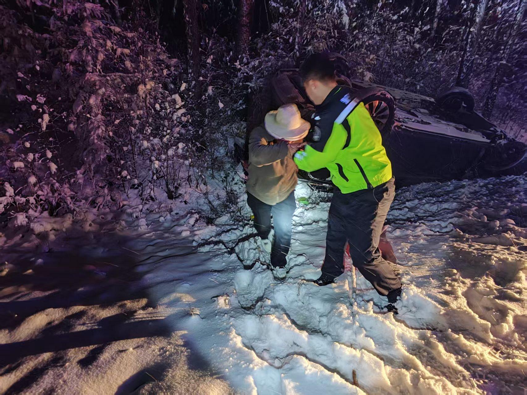 到達現(xiàn)場后,民警立即下車進行查看,發(fā)現(xiàn)一輛外地車牌的小型汽車側翻在3米的道路下,一對中年夫妻正在車內拿取行李箱。見此情形,民警立即向夫妻施以援手,將這對夫妻從溝中拉拽上來,在確認二人安全后了解到,二人駕駛車輛從呼瑪趕往漠河,因對路況不熟,加之駕駛人在冰雪路面駕車經(jīng)驗不足,操作不當,導致車輛側翻。
