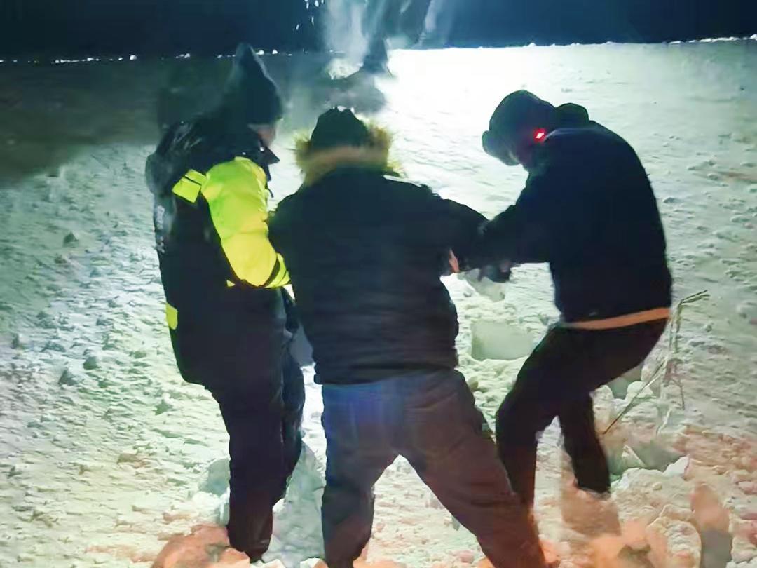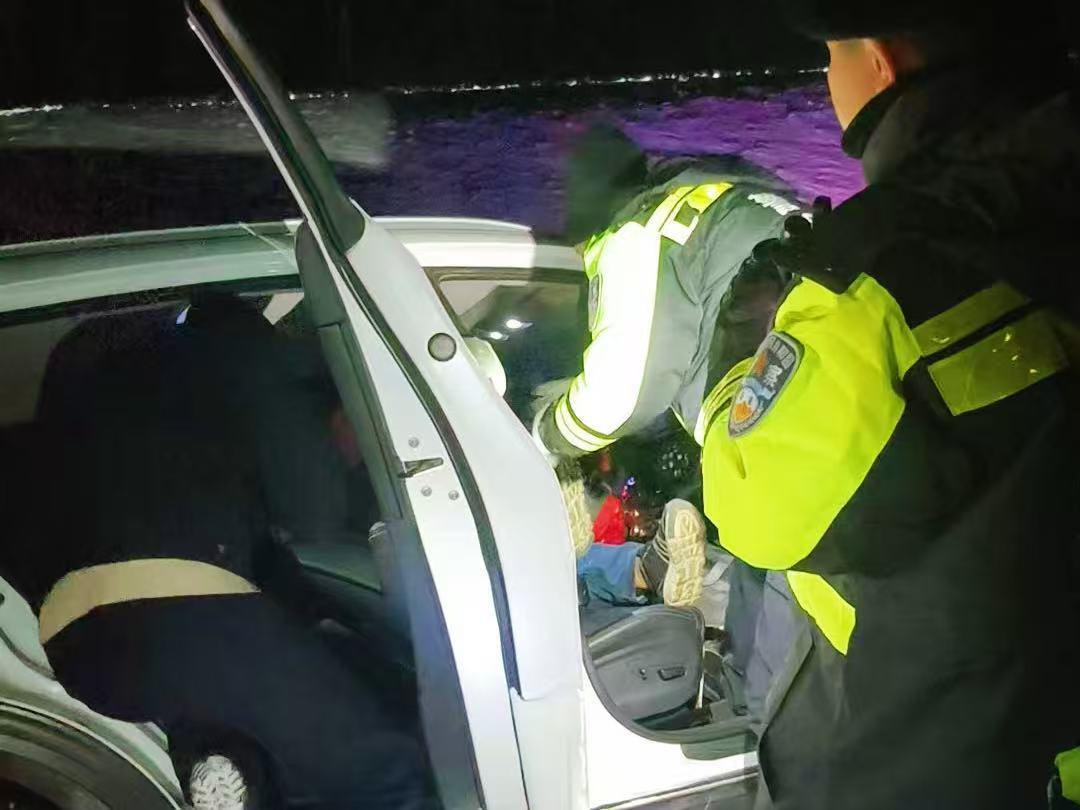 抵達(dá)現(xiàn)場后,民輔警第一時間查看被困人員狀態(tài),通過簡單詢問,確認(rèn)無人員受傷,隨即立刻展開低溫救援,由于溝坡陡滑,常規(guī)救援設(shè)備無法使用。民輔警毫不猶豫地滑下溝底,并迅速從副駕駛展開救援,經(jīng)過不懈努力,十分鐘后成功將被困人員從車內(nèi)救出。隨后,民輔警主動幫助聯(lián)系拖車公司將車輛送至維修廠檢修,并用警車將游客接回派出所安置。抵達(dá)白銀納派出所后,值班輔警遞出早已準(zhǔn)備好的熱水和蛋糕?!皽囟冗_(dá)到零下36℃,手機(jī)凍得即將關(guān)機(jī),還好有人民警察幫忙,不然真的不知道該怎么辦了?!北痪戎罕姼屑さ恼f道。