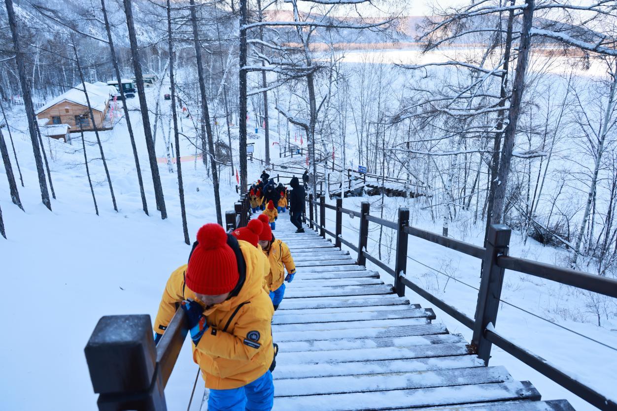 孩子們排成一串靈動(dòng)的小隊(duì),踩著積雪在棧道上噠噠前行,腳下“咯吱咯吱”的清脆聲響,為這場(chǎng)研學(xué)之旅奏響歡快序曲。軟糯的廣西口音此起彼伏,孩子們或好奇地觸摸棧道積雪,冰涼的觸感讓他們瞇起眼睛直跺腳;或緊緊抓著欄桿,任憑小臉凍得通紅,仍目不轉(zhuǎn)睛眺望遠(yuǎn)方“Ω”形的冰封江灣,沉浸式感受北國(guó)冰雪的奇妙。那一抹抹跳動(dòng)的橘色,在純白世界中宛如一團(tuán)團(tuán)小火苗,格外耀眼。