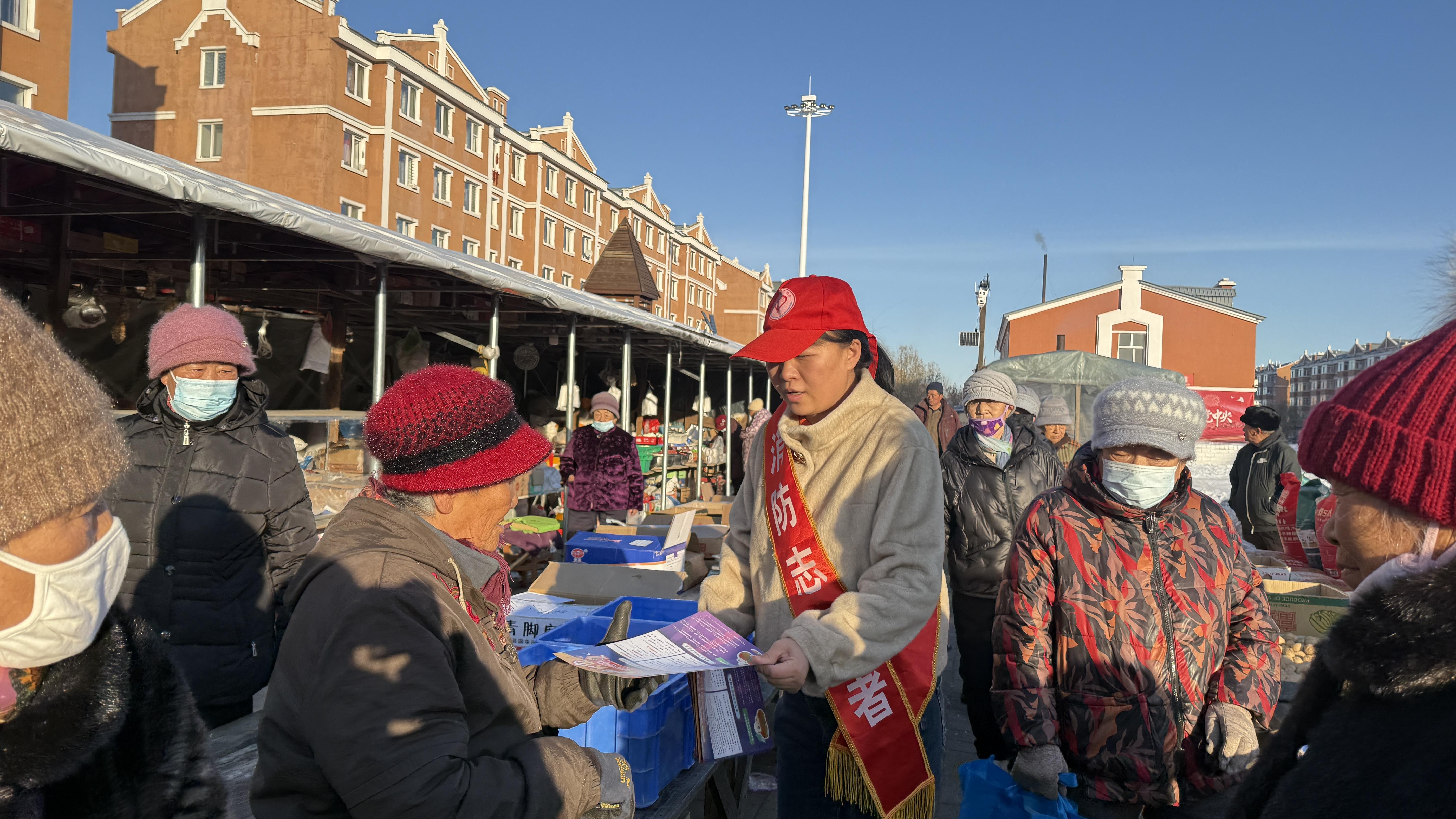 消防志愿者向廣場(chǎng)商戶經(jīng)營者發(fā)放宣傳單并叮囑冬季安全用火用電(胡春磊 攝)